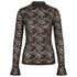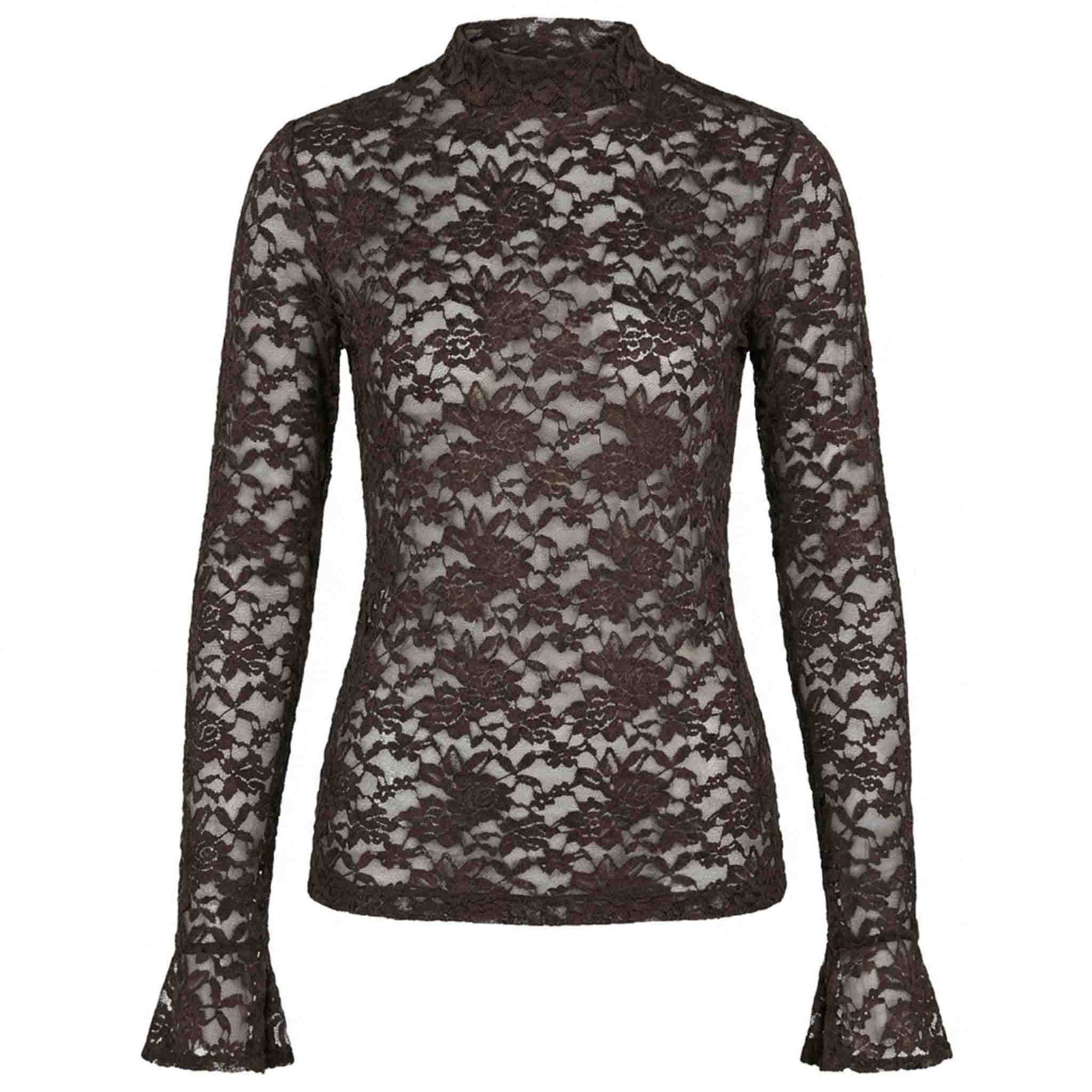 De top is aansluitend maar van stretch kant dus comfortabel om de hele dag te dragen. De ronde opstaande hals geeft een rustige, elegante look, terwijl de lange mouwen met trompet manchet juist een speels detail toevoegen.