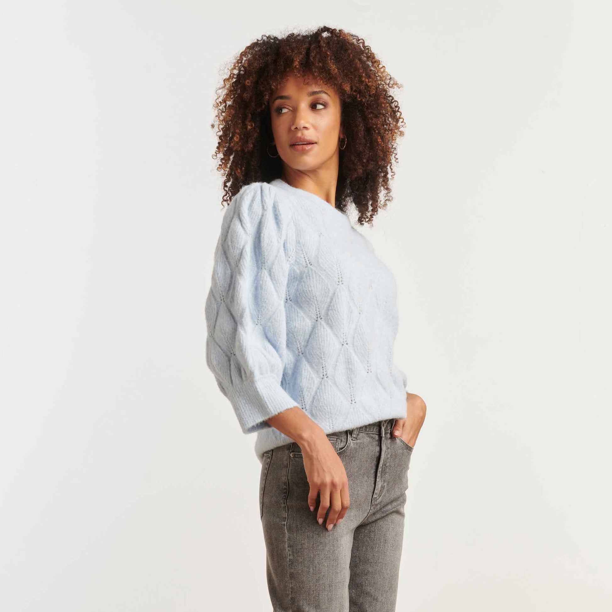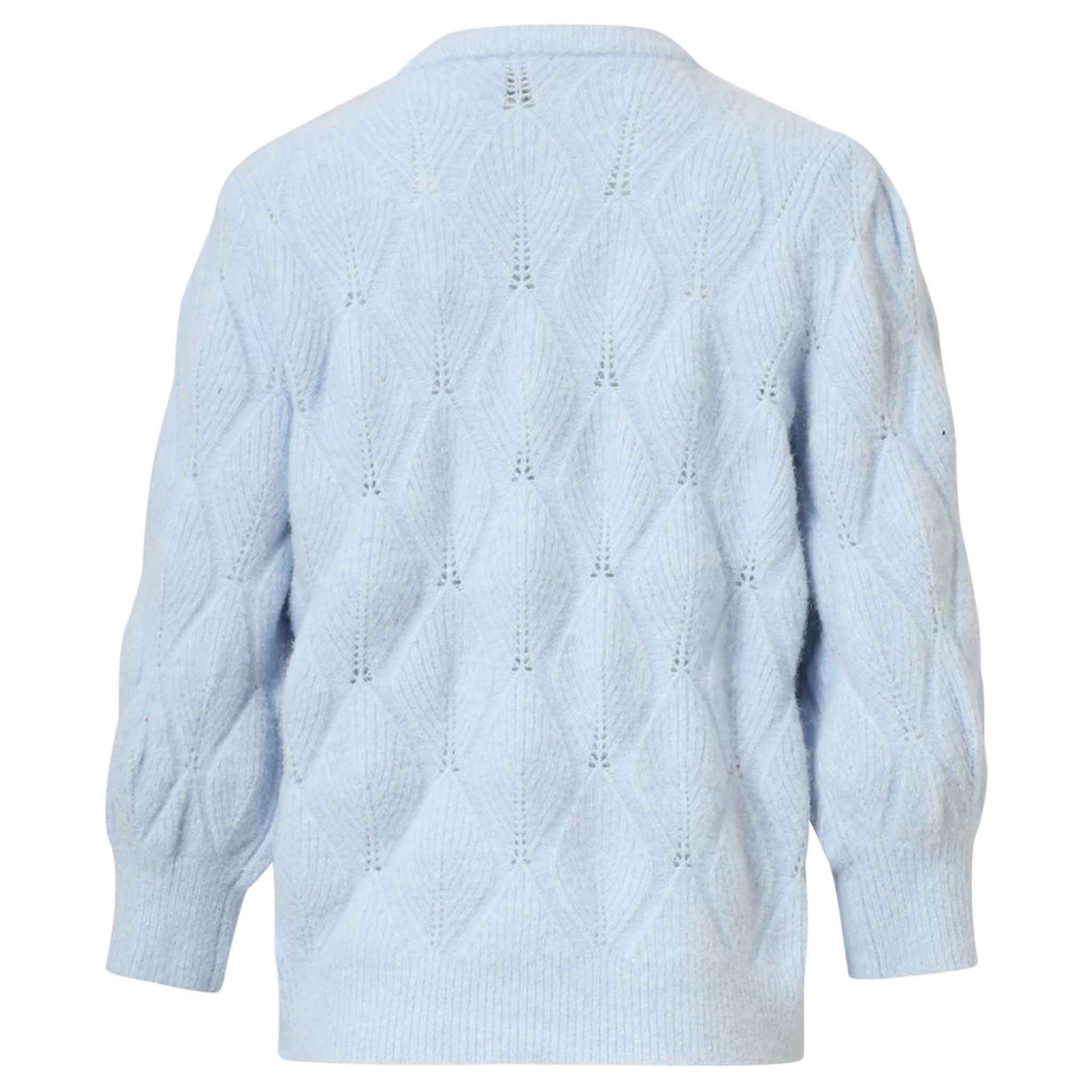 Kenmerken: ✦ Ronde hals ✦ 3/4 Mouw met brede boord ✦ Boord aan onderzijde ✦ Breisel met gebobbeld kabelmotief