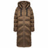 Lange nepdonsjas tot over de knie van hoogwaardige tweekleurige stof met verborgen zijsplit. De buitenstof is van nylon. Opstaande kraag met vaste capuchon en decoratieve gebreide banden. Tweewegs ritssluiting en onderflap, in de naad gevoerde zakken met rits. Mouwzoom met gebreide manchetten. MANISA-mouwembleem. Ton-sur-ton voering met contrasterende biezen en binnenzak met rits. De jas is geen regenjas dus niet waterdicht.